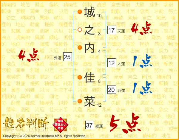 生活面を象徴する運勢です。外部から受ける影響力を表し、結婚運、家庭運や職場、環境への順応性を表します。総運から人運を引いた画数。姓や名が1文字の場合を除く。