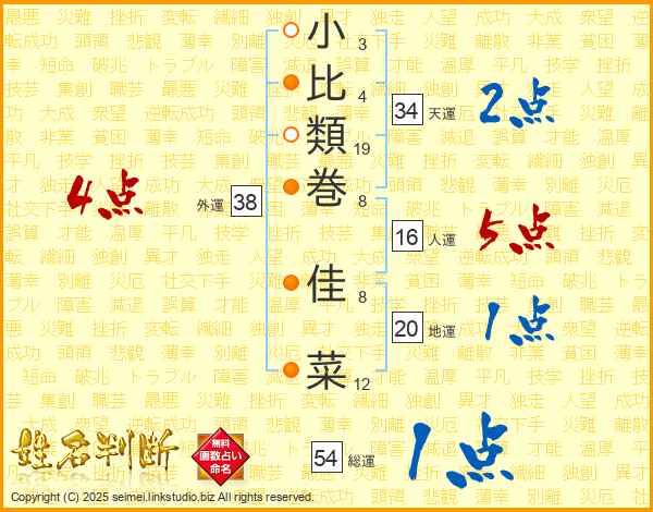 小(3画)比(4画)類(19画)巻(8画) 佳(8画)菜(12画)