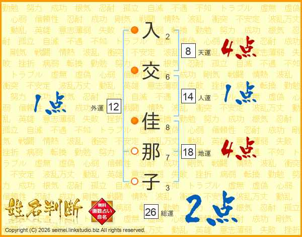 入(2画)交(6画) 佳(8画)那(7画)子(3画)