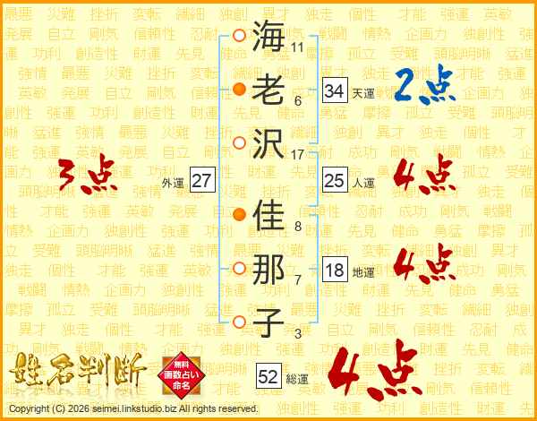 海(11画)老(6画)沢(17画) 佳(8画)那(7画)子(3画)