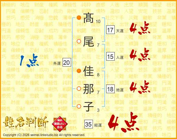髙(10画)尾(7画) 佳(8画)那(7画)子(3画)
