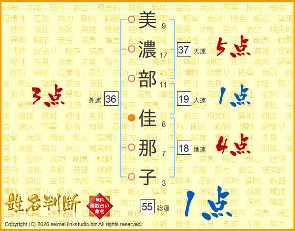 美(9画)濃(17画)部(11画) 佳(8画)那(7画)子(3画)