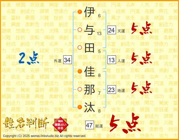 伊(6画)与(13画)田(5画) 佳(8画)那(7画)汰(8画)