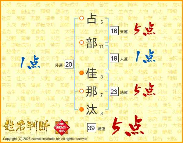 占(5画)部(11画) 佳(8画)那(7画)汰(8画)