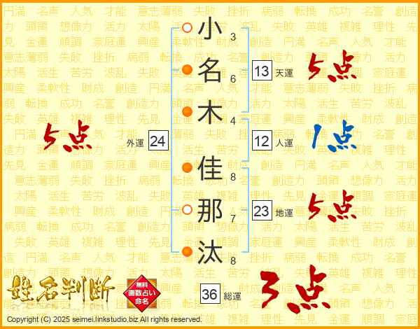 小(3画)名(6画)木(4画) 佳(8画)那(7画)汰(8画)