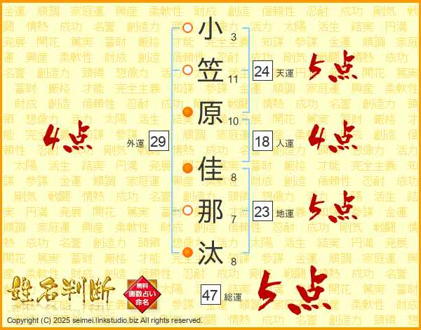 小笠原佳那汰さんの総運は47画の5点!