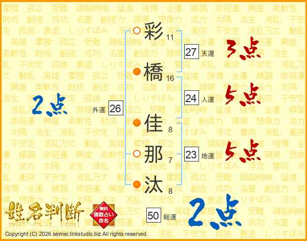 彩橋佳那汰さんの外運は26画の2点!