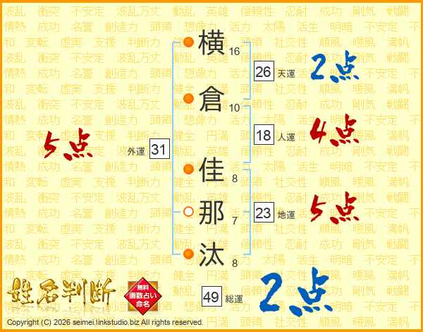 横倉佳那汰さんの総運は49画の2点!