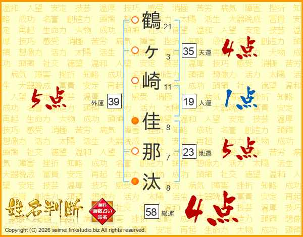鶴ヶ崎佳那汰さんの総運は58画の4点!
