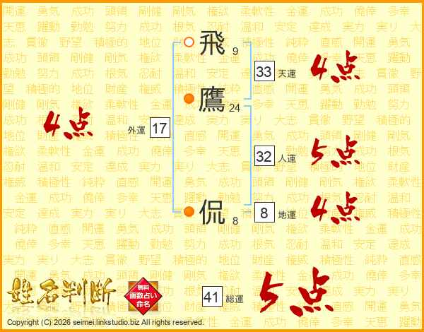 飛鷹侃さんの総運は41画の5点!