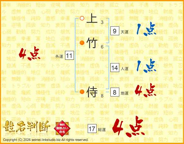 生活面を象徴する運勢です。外部から受ける影響力を表し、結婚運、家庭運や職場、環境への順応性を表します。総運から人運を引いた画数。姓や名が1文字の場合を除く。