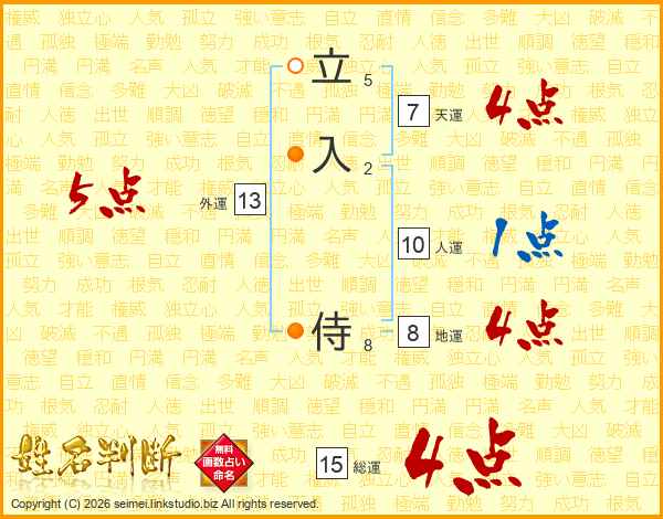 生活面を象徴する運勢です。外部から受ける影響力を表し、結婚運、家庭運や職場、環境への順応性を表します。総運から人運を引いた画数。姓や名が1文字の場合を除く。