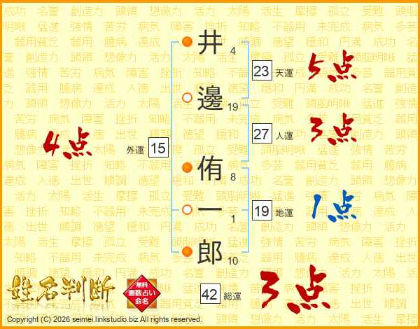 井(4画)邊(19画) 侑(8画)一(1画)郎(10画)