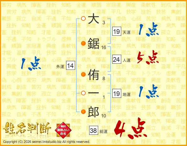 大(3画)鋸(16画) 侑(8画)一(1画)郎(10画)