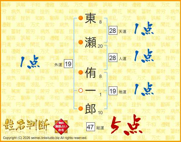 東(8画)瀬(20画) 侑(8画)一(1画)郎(10画)