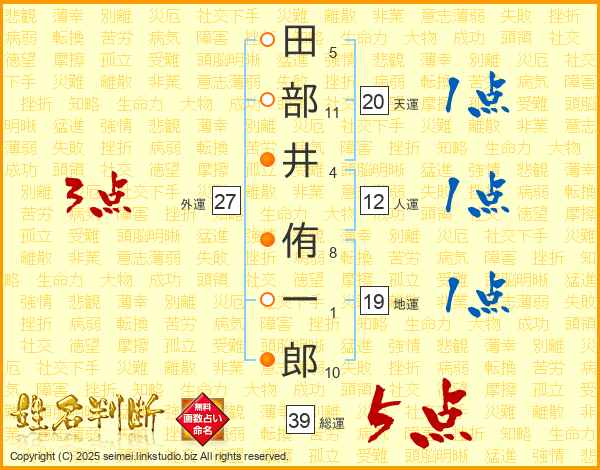田(5画)部(11画)井(4画) 侑(8画)一(1画)郎(10画)