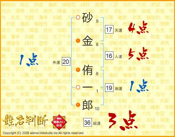 砂(9画)金(8画) 侑(8画)一(1画)郎(10画)