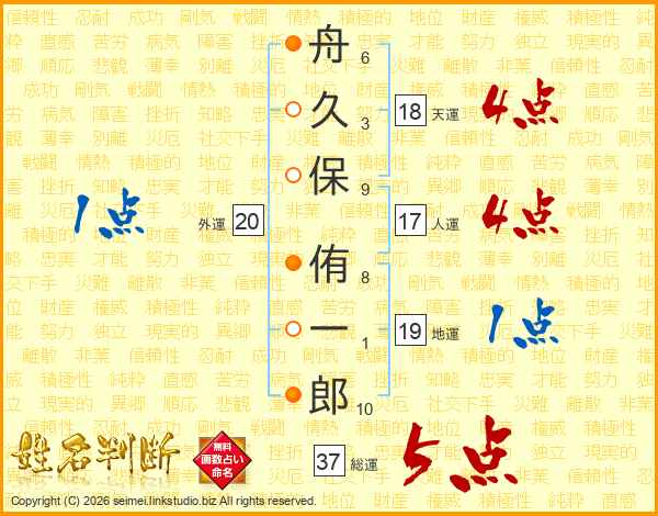 舟(6画)久(3画)保(9画) 侑(8画)一(1画)郎(10画)