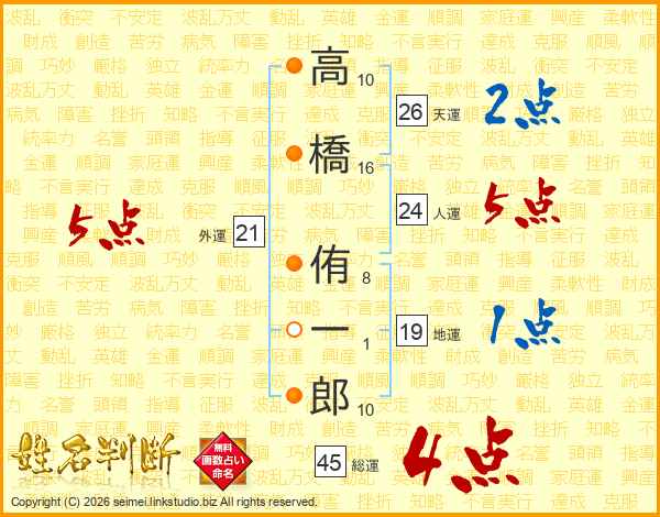 高(10画)橋(16画) 侑(8画)一(1画)郎(10画)
