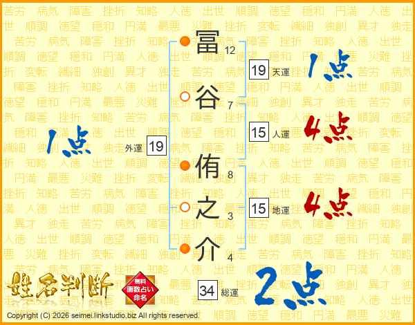 冨(12画)谷(7画) 侑(8画)之(3画)介(4画)