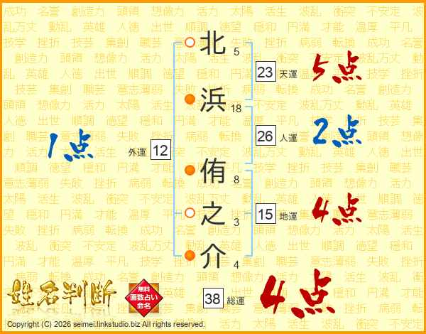 北(5画)浜(18画) 侑(8画)之(3画)介(4画)