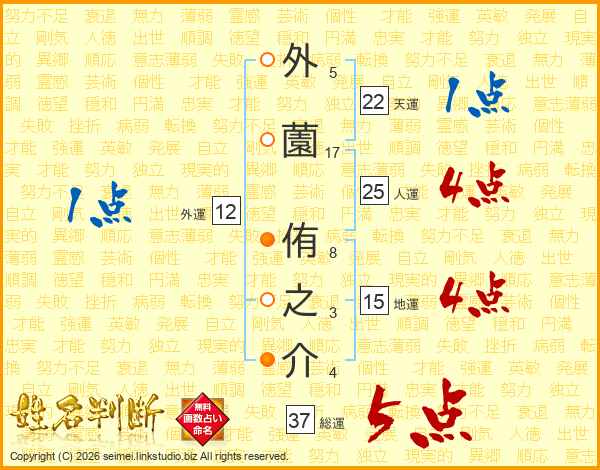 外(5画)薗(17画) 侑(8画)之(3画)介(4画)