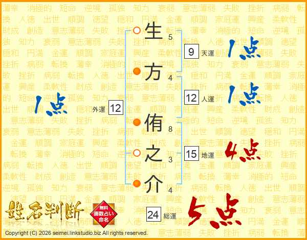 生(5画)方(4画) 侑(8画)之(3画)介(4画)