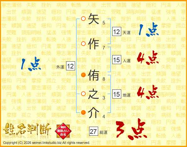 矢(5画)作(7画) 侑(8画)之(3画)介(4画)