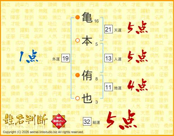 あなたの人生を表す1番重要な運勢です。生涯を通じて影響する総合運となり、主に50歳以降の晩年期に影響を及ぼします。苗字と名前の合計画数。