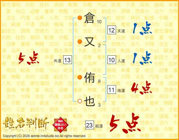倉(10画)又(2画) 侑(8画)也(3画)