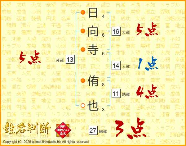 日(4画)向(6画)寺(6画) 侑(8画)也(3画)