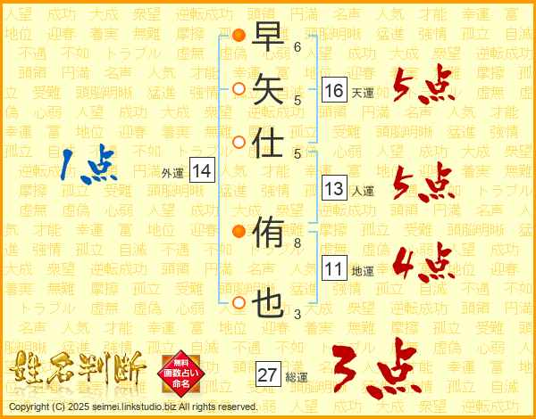 早(6画)矢(5画)仕(5画) 侑(8画)也(3画)