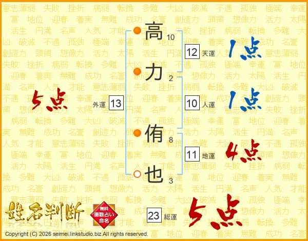 高(10画)力(2画) 侑(8画)也(3画)