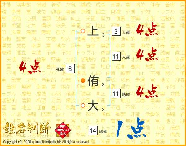 生活面を象徴する運勢です。外部から受ける影響力を表し、結婚運、家庭運や職場、環境への順応性を表します。総運から人運を引いた画数。姓や名が1文字の場合を除く。
