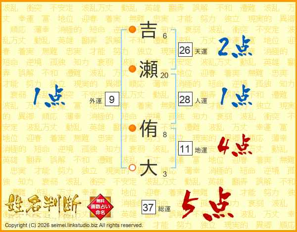 吉(6画)瀬(20画) 侑(8画)大(3画)