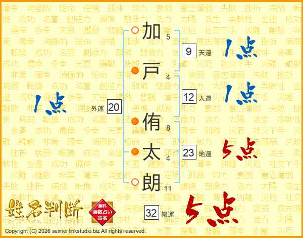 加(5画)戸(4画) 侑(8画)太(4画)朗(11画)