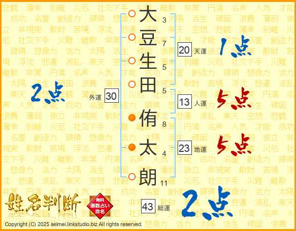 大(3画)豆(7画)生(5画)田(5画) 侑(8画)太(4画)朗(11画)