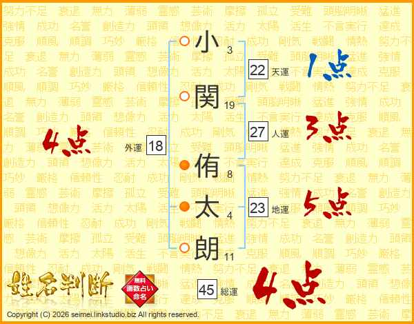 小(3画)関(19画) 侑(8画)太(4画)朗(11画)