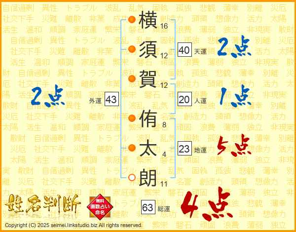 横(16画)須(12画)賀(12画) 侑(8画)太(4画)朗(11画)