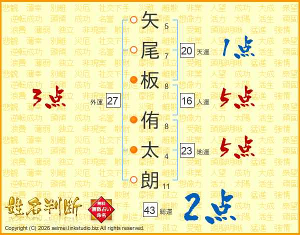 矢(5画)尾(7画)板(8画) 侑(8画)太(4画)朗(11画)