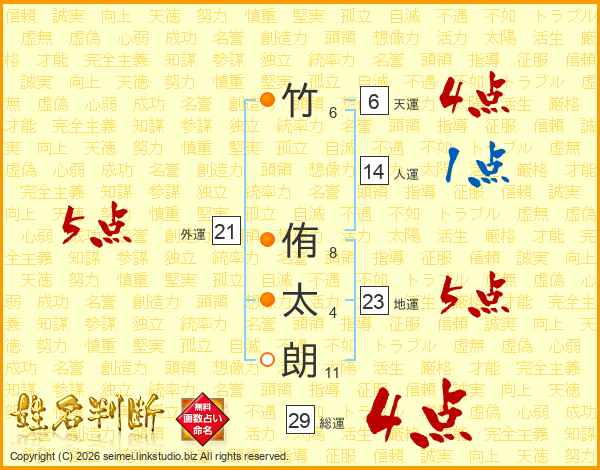 竹(6画) 侑(8画)太(4画)朗(11画)