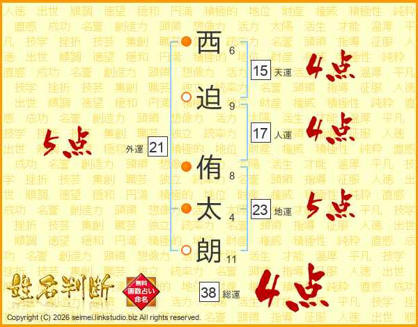 西(6画)迫(9画) 侑(8画)太(4画)朗(11画)