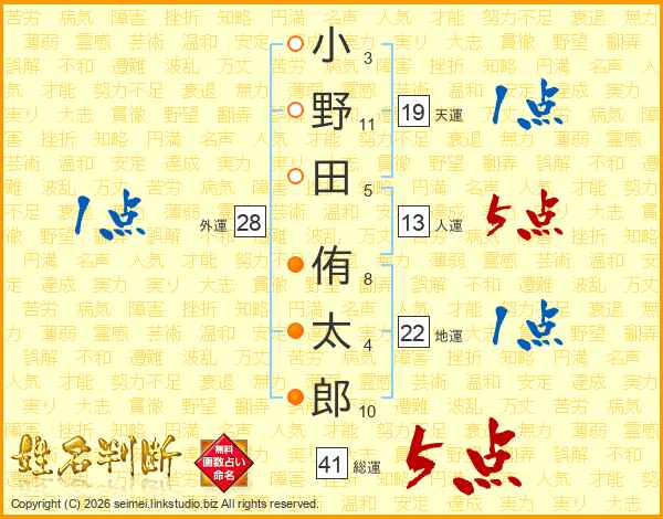 小野田侑太郎さんの総運は41画の5点!