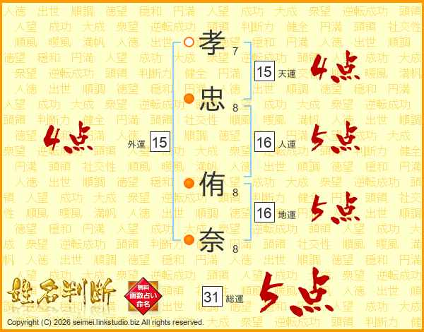 孝(7画)忠(8画) 侑(8画)奈(8画)