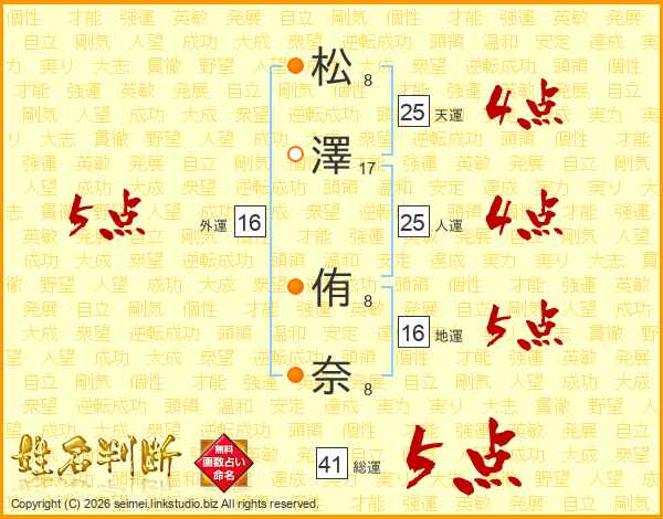 松(8画)澤(17画) 侑(8画)奈(8画)