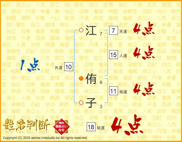生活面を象徴する運勢です。外部から受ける影響力を表し、結婚運、家庭運や職場、環境への順応性を表します。総運から人運を引いた画数。姓や名が1文字の場合を除く。