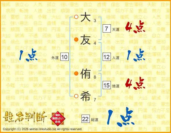 あなたの人生を表す1番重要な運勢です。生涯を通じて影響する総合運となり、主に50歳以降の晩年期に影響を及ぼします。苗字と名前の合計画数。