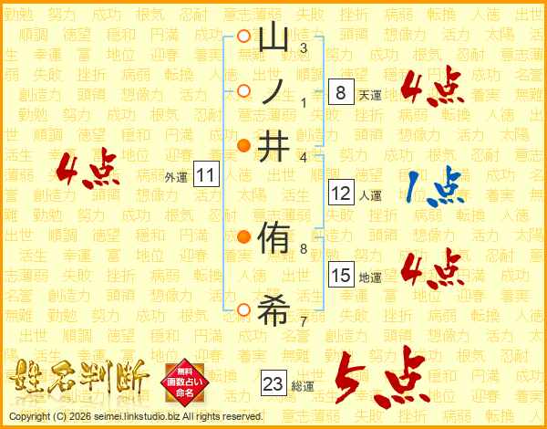 山(3画)ノ(1画)井(4画) 侑(8画)希(7画)