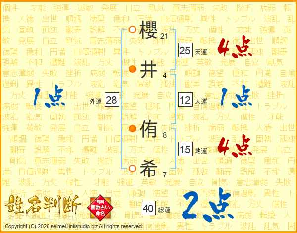 櫻(21画)井(4画) 侑(8画)希(7画)