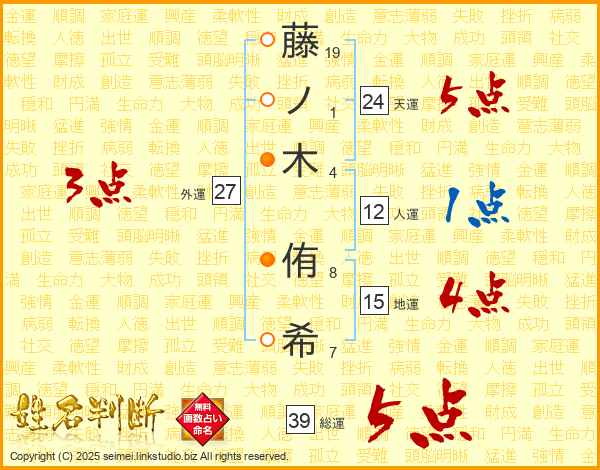 藤(19画)ノ(1画)木(4画) 侑(8画)希(7画)